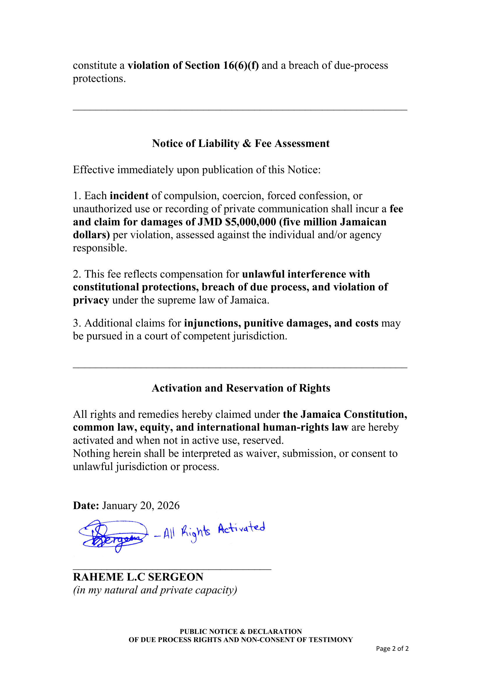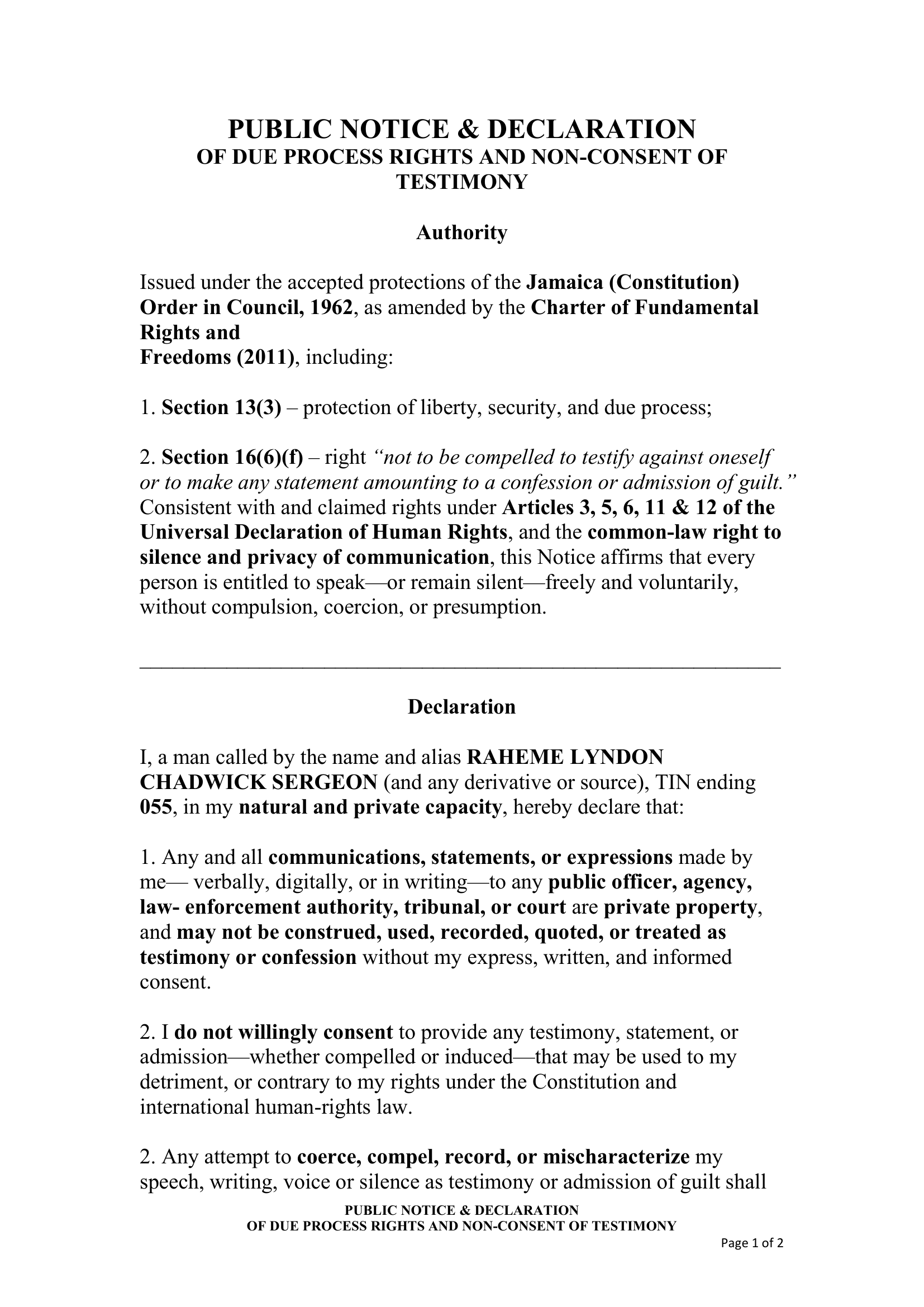 February 12, 2026 – Public Notice and Declaration of Due Process Rights and Non-Consent of Testimony – RS-DEC0007
