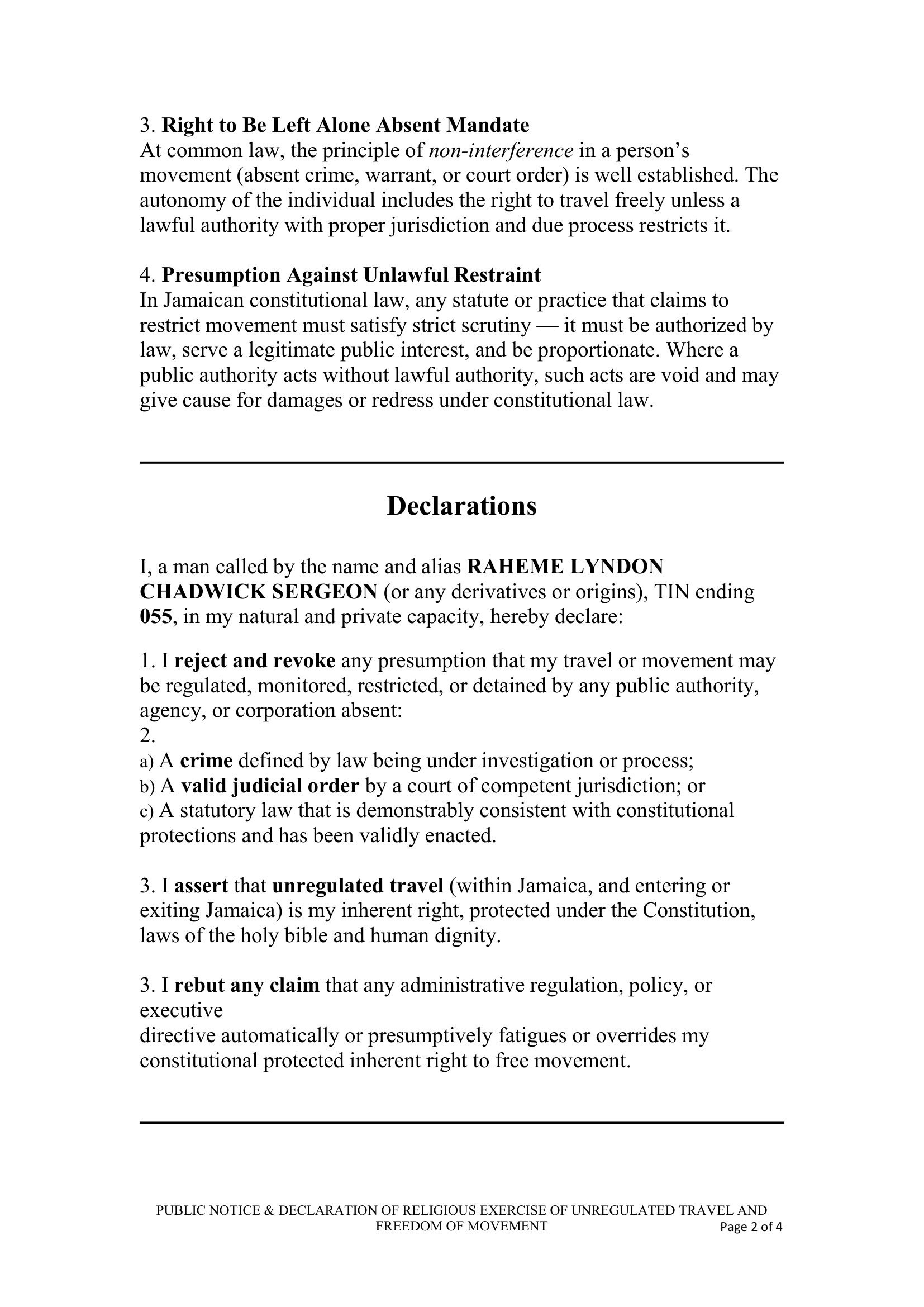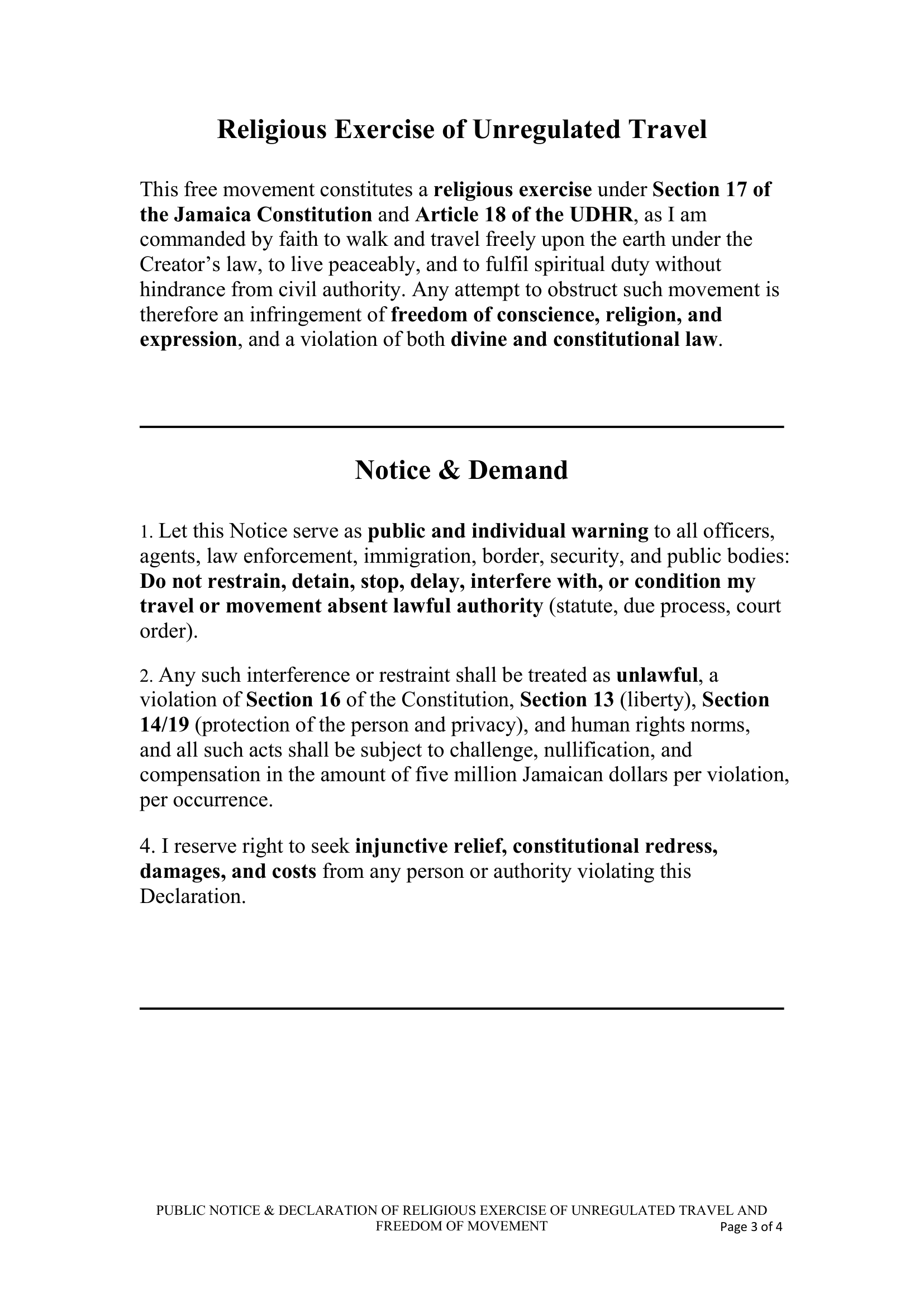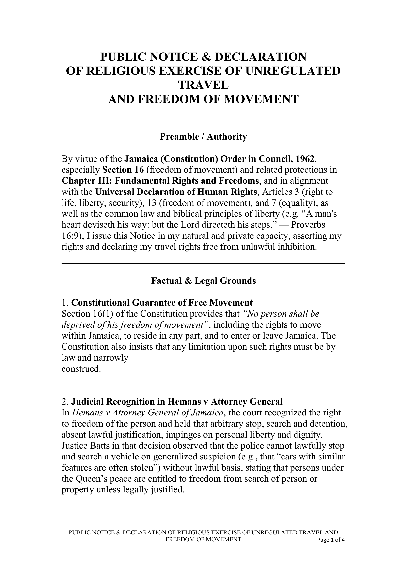 February 12, 2016 – Public Notice and Declaration of Religious Exercise of Unregulated Travel and Freedom of Movement – RS-DEC0005