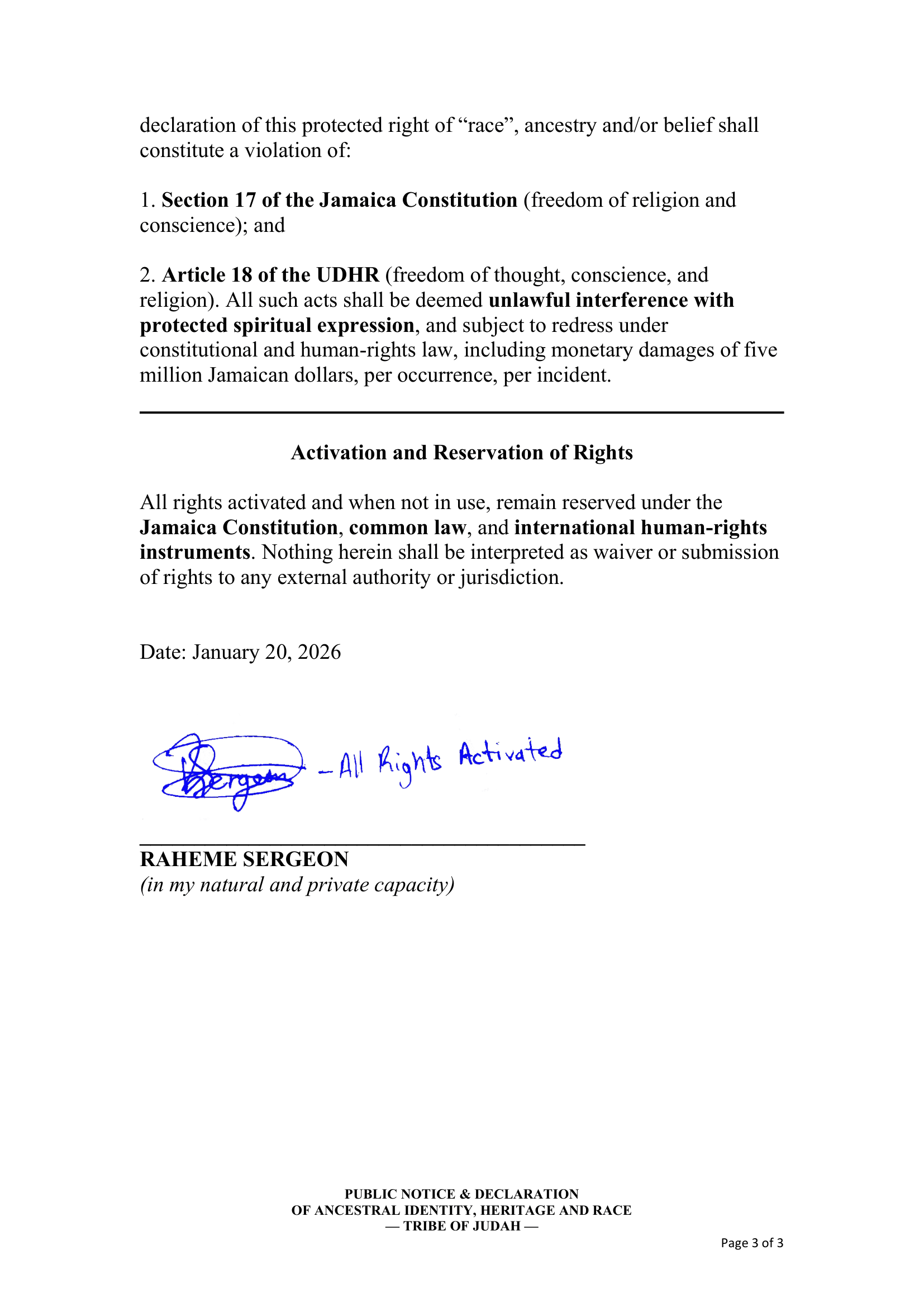February 12, 2026 – Public Declaration of Religion and Protected Right – RS-DEC0001