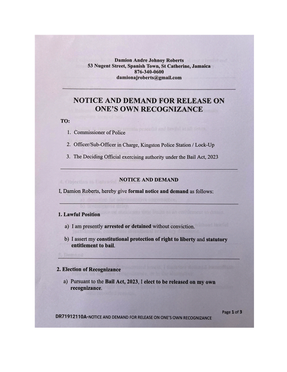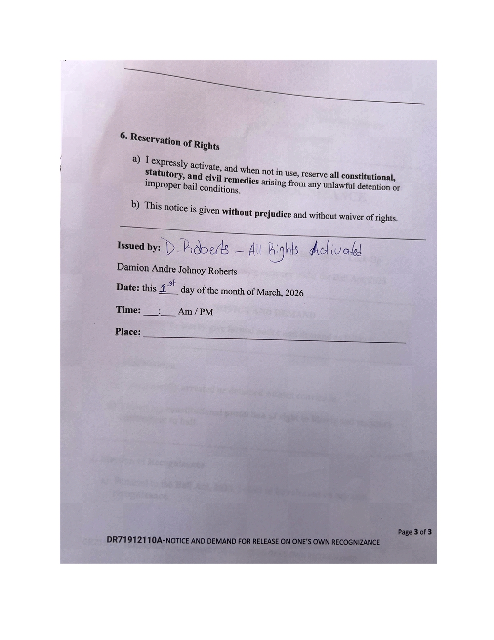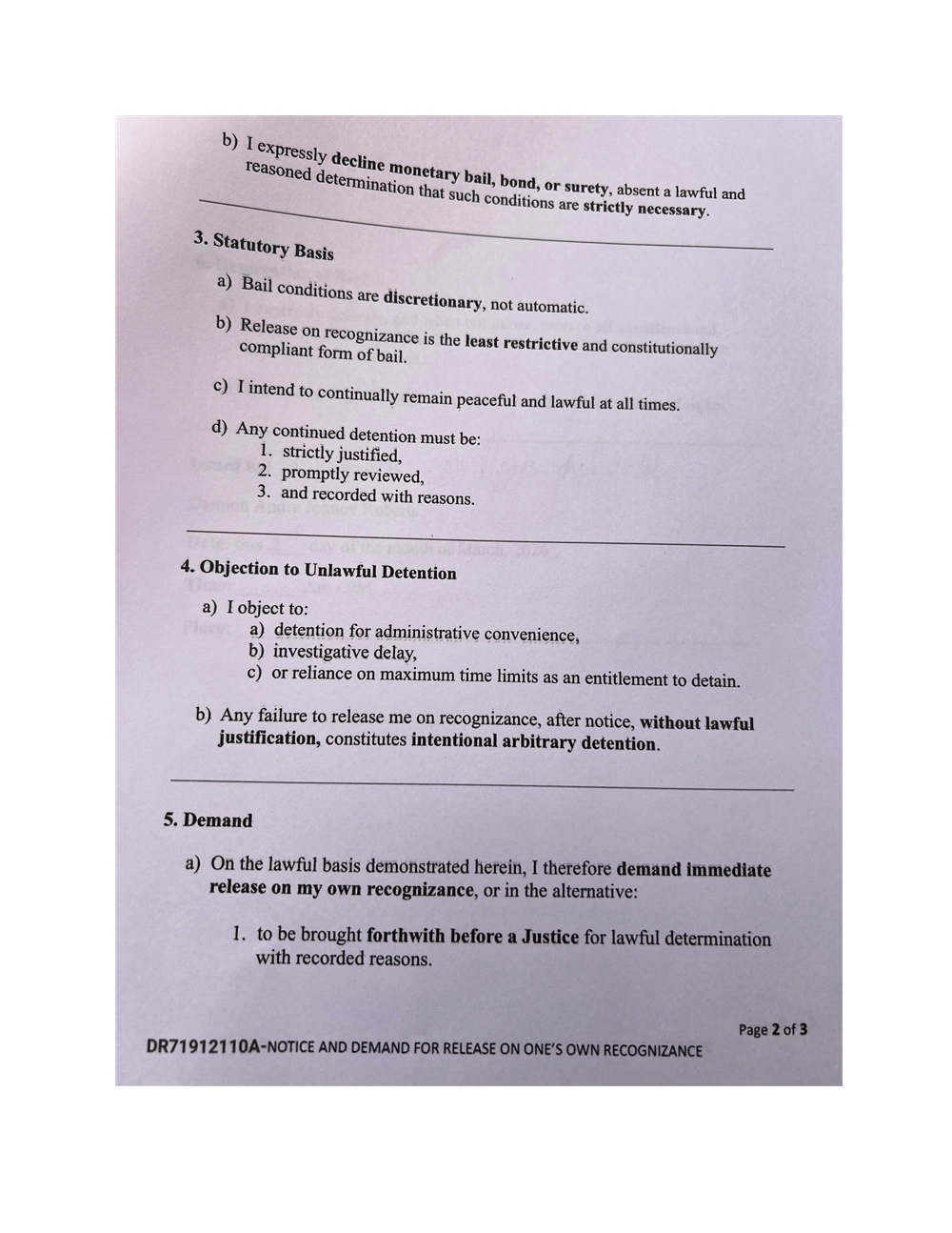 Notice #5 – Notice And Demand for Release On One’s Own Recognizance- DR71912110A