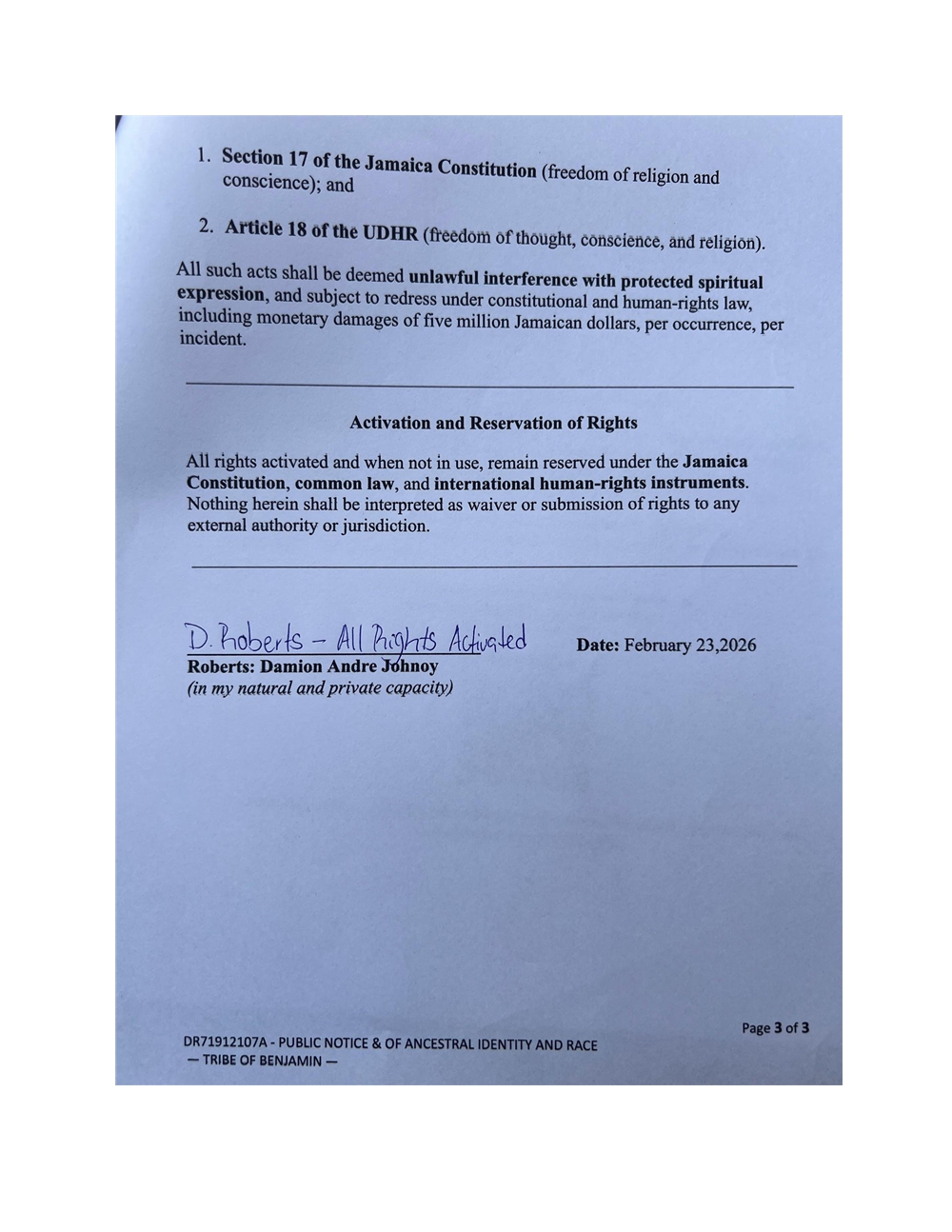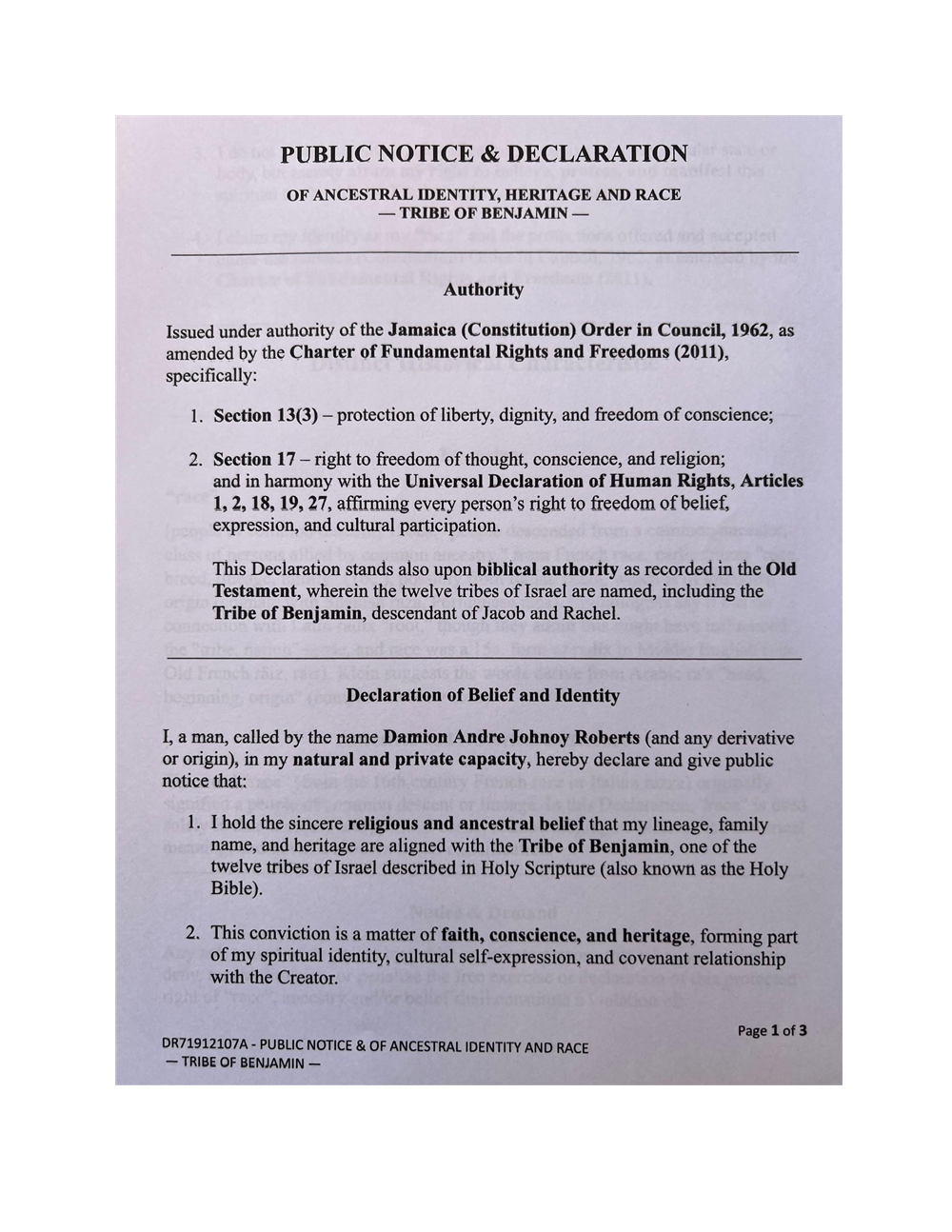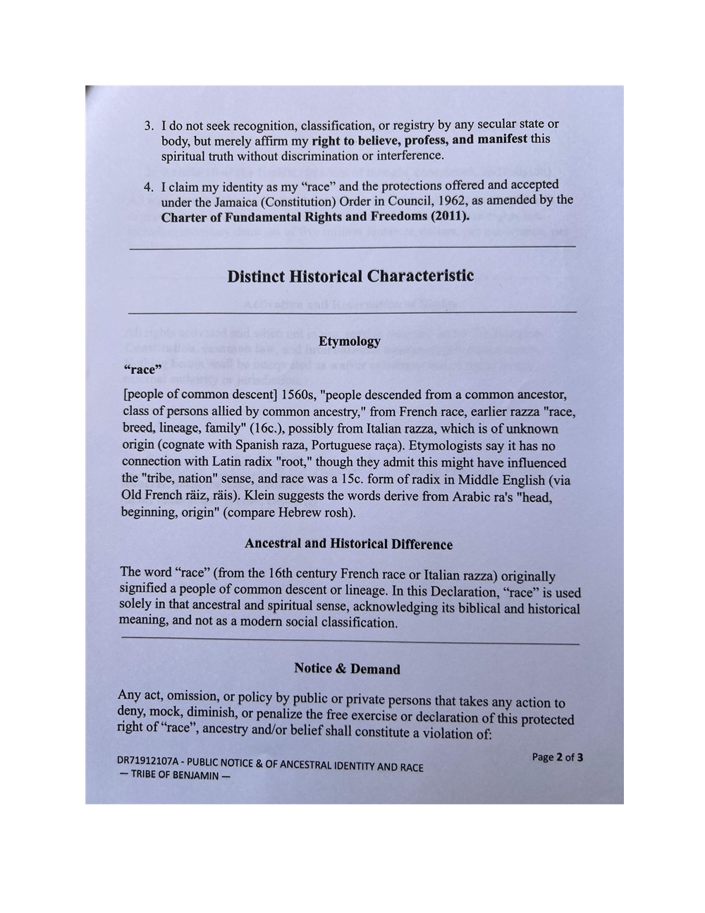 Notice #8 – Public Notice And Declaration Of Ancestral Identity, Heritage And Race —TRIBE OF BENJAMIN — DR71912107A