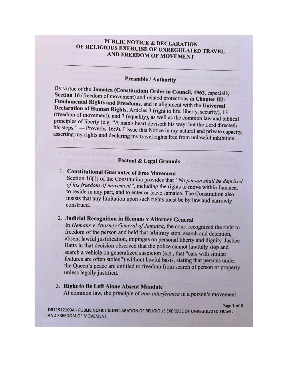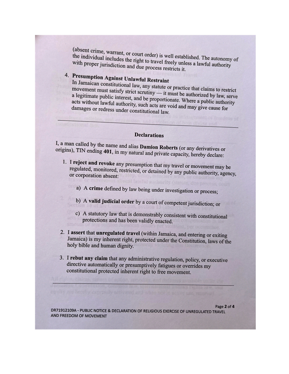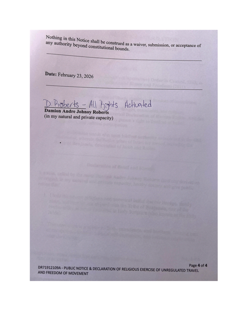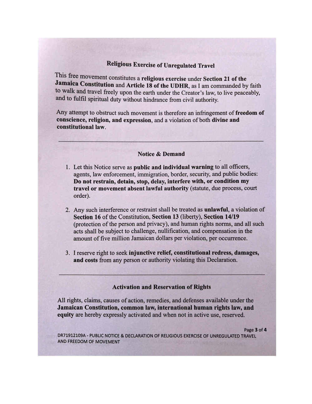 Notice #7 – Public Notice And Declaration Of Religious Exercise Of Unregulated Travel And Freedom Of Movement – ­DR71912109A